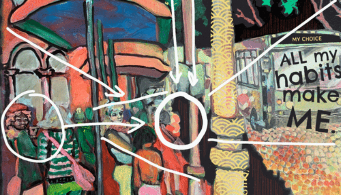 In the painting and now the design, the bus is coming, it’s nearly at the bus stop where everyone is waiting. My habits make me. Daily decisions determine my future, bit by bit. Where is the bus going? MY CHOICE. So I added that digitally.